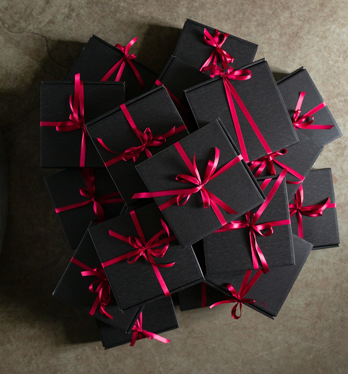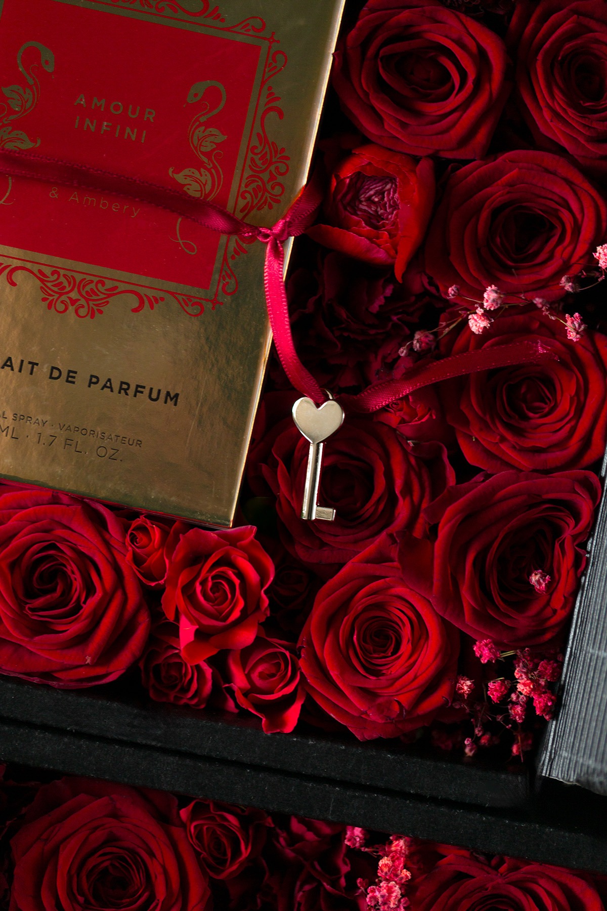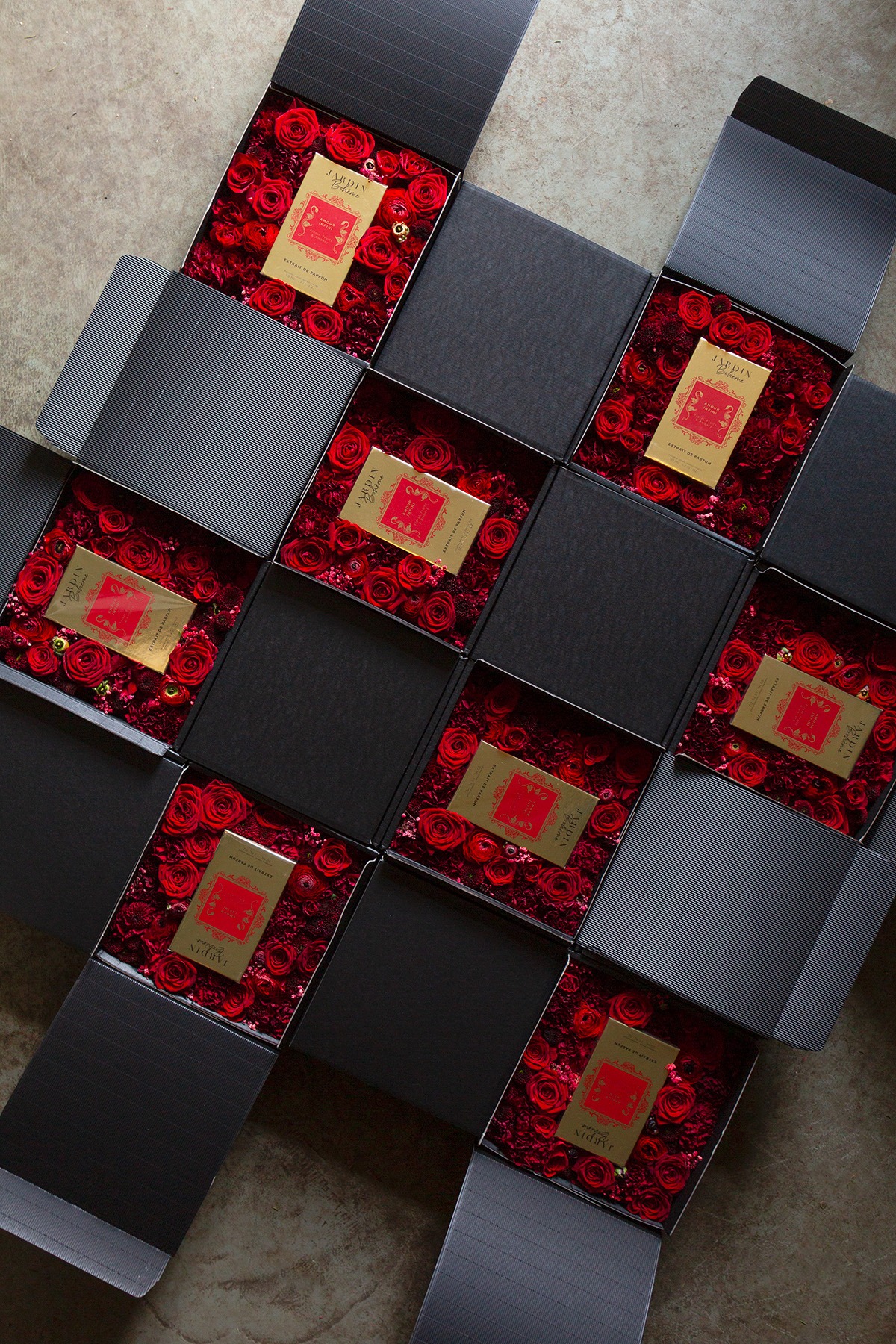 Rather than designing a traditional bouquet, the intention was to create a complete gift experience—something that combines floral beauty with fragrance, and feels considered from every angle. The deep red tones evoke romance and intensity, while the structured black boxes add a sense of modern elegance.