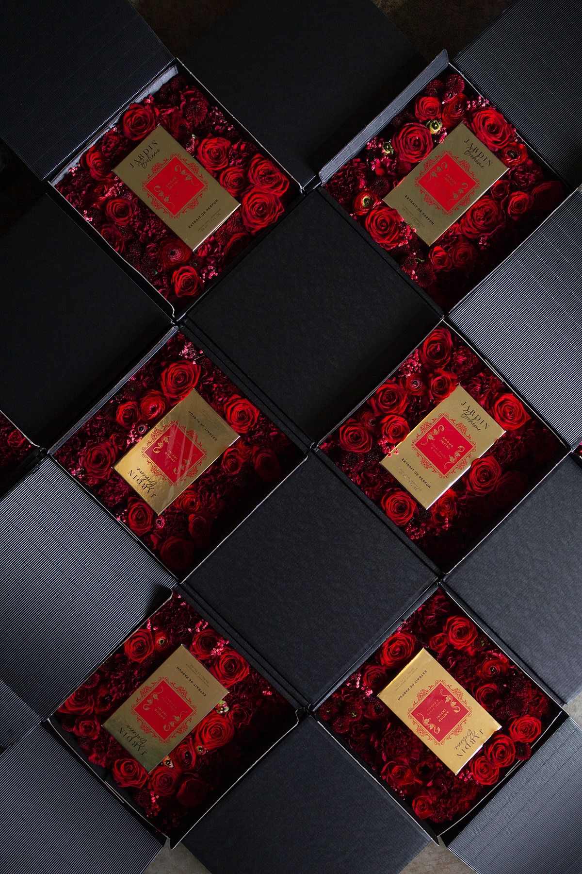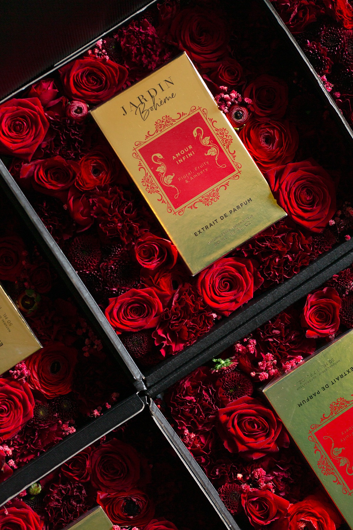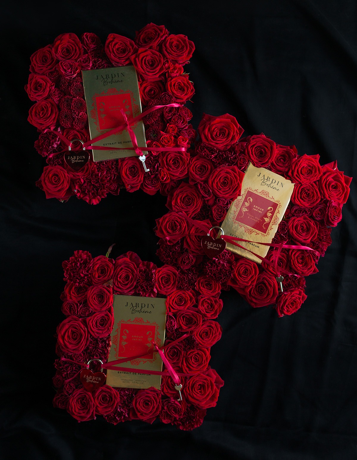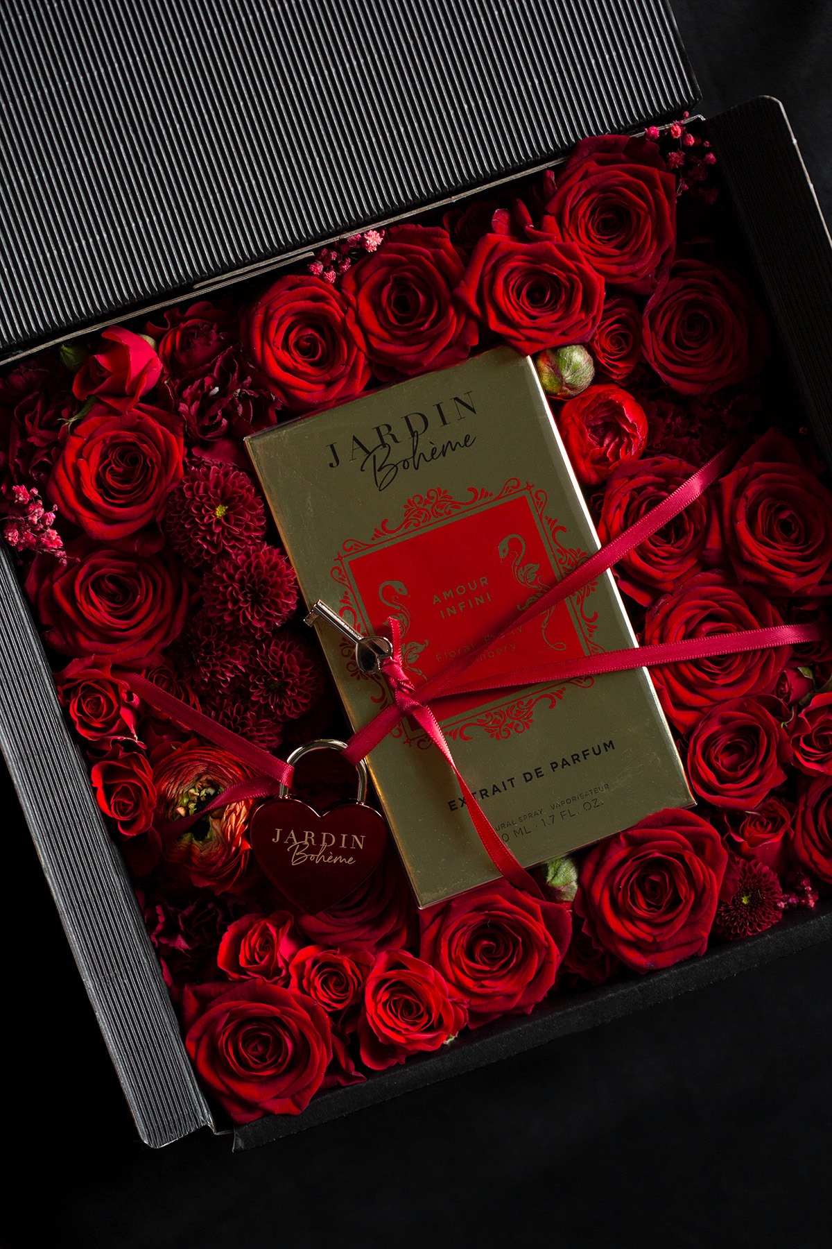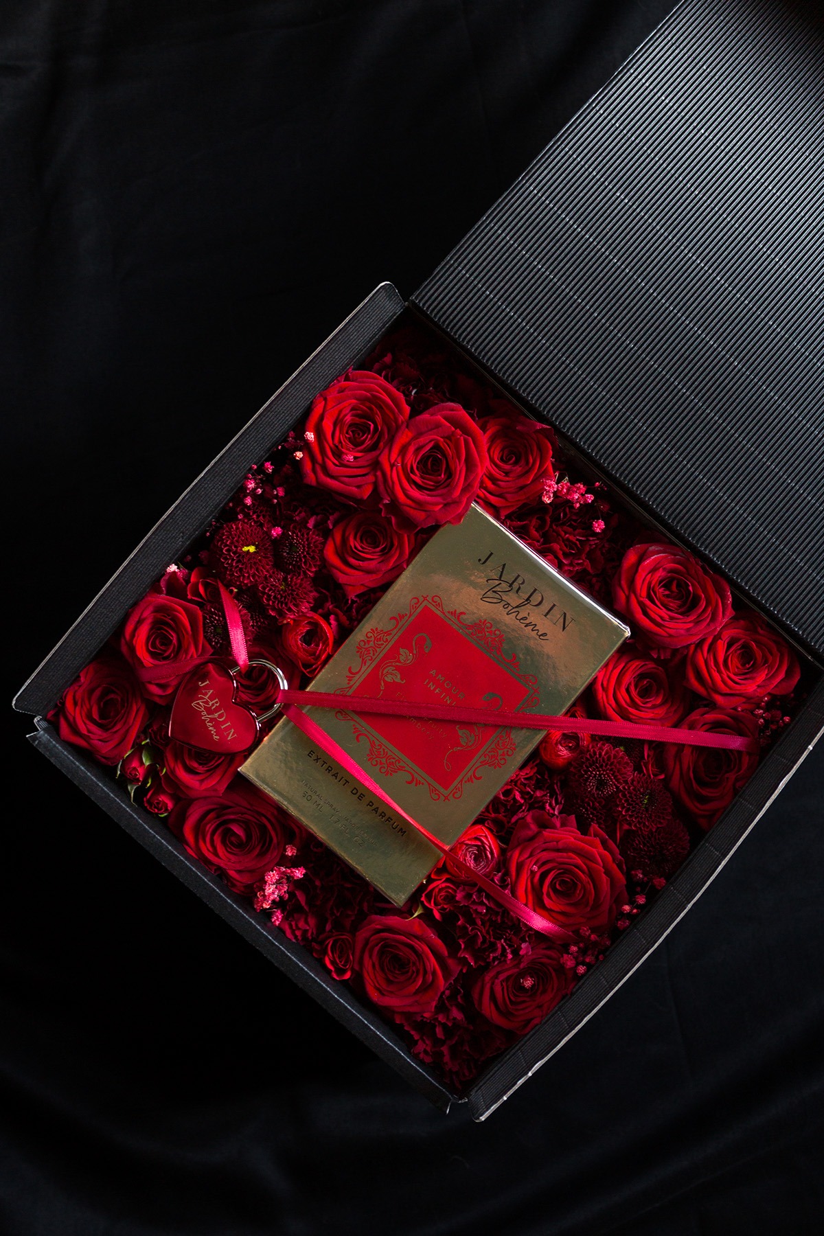 The concept centers around luxurious flower boxes composed of red roses, delicate spray roses, and deep red carnations. Each arrangement was carefully designed within black boxes, creating a bold contrast that feels both contemporary and refined. At the heart of every composition sits the Jardin Bohème perfume, seamlessly integrated as a visual and sensory focal point.