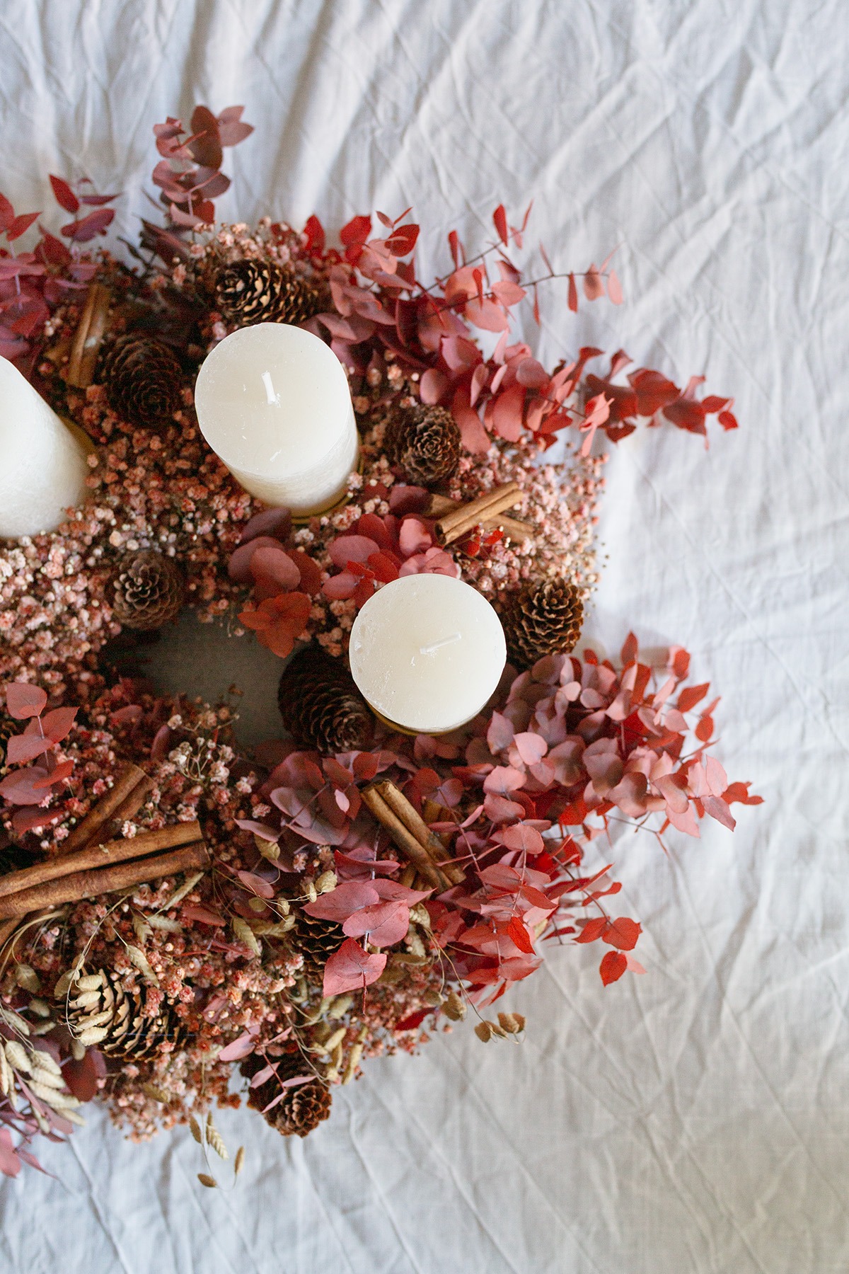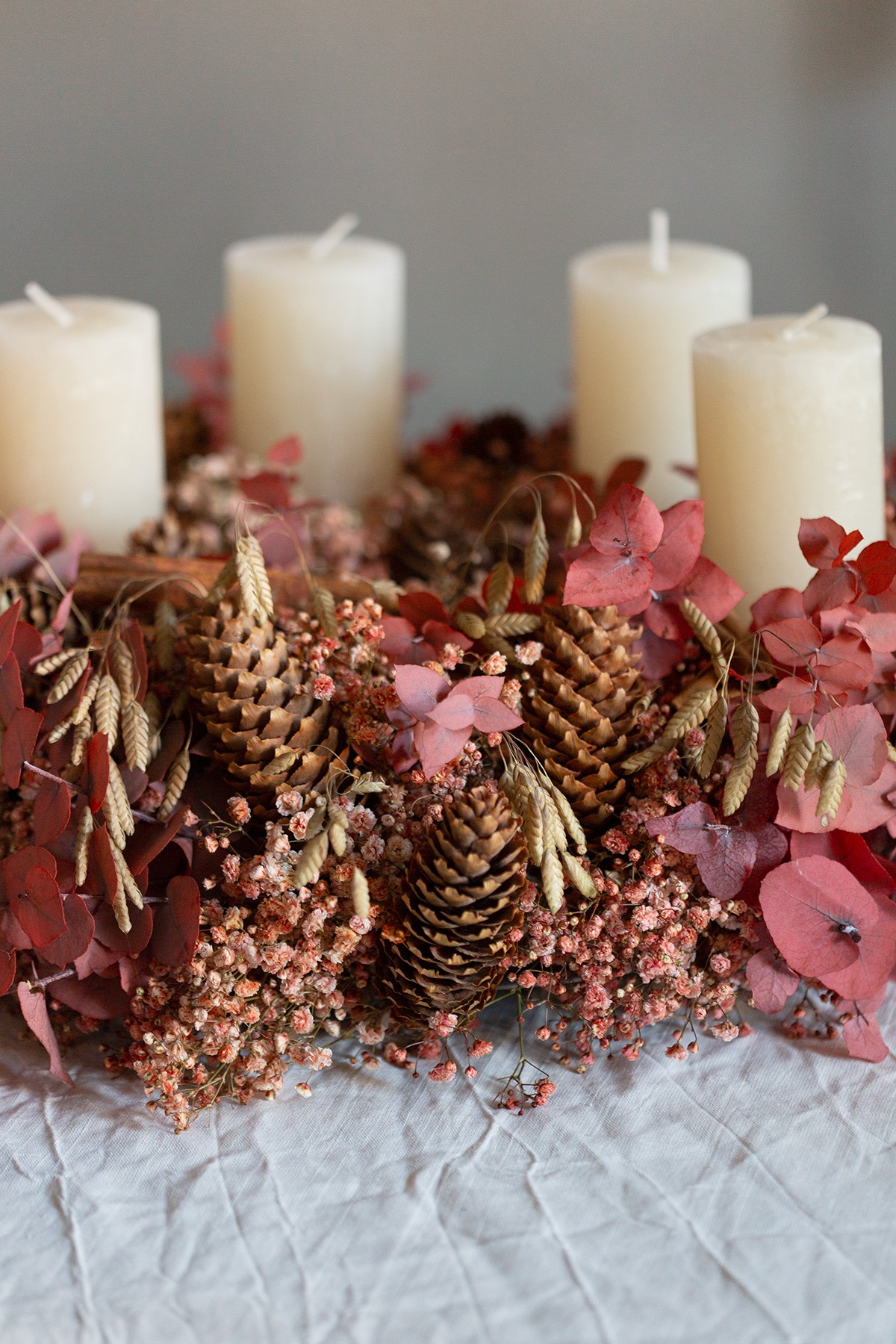 This modern Advent wreath with dried materials combines the warmth of tradition with a fresh, contemporary touch. Perfect as a festive centerpiece, door decoration, or a thoughtful Christmas gift for someone special.