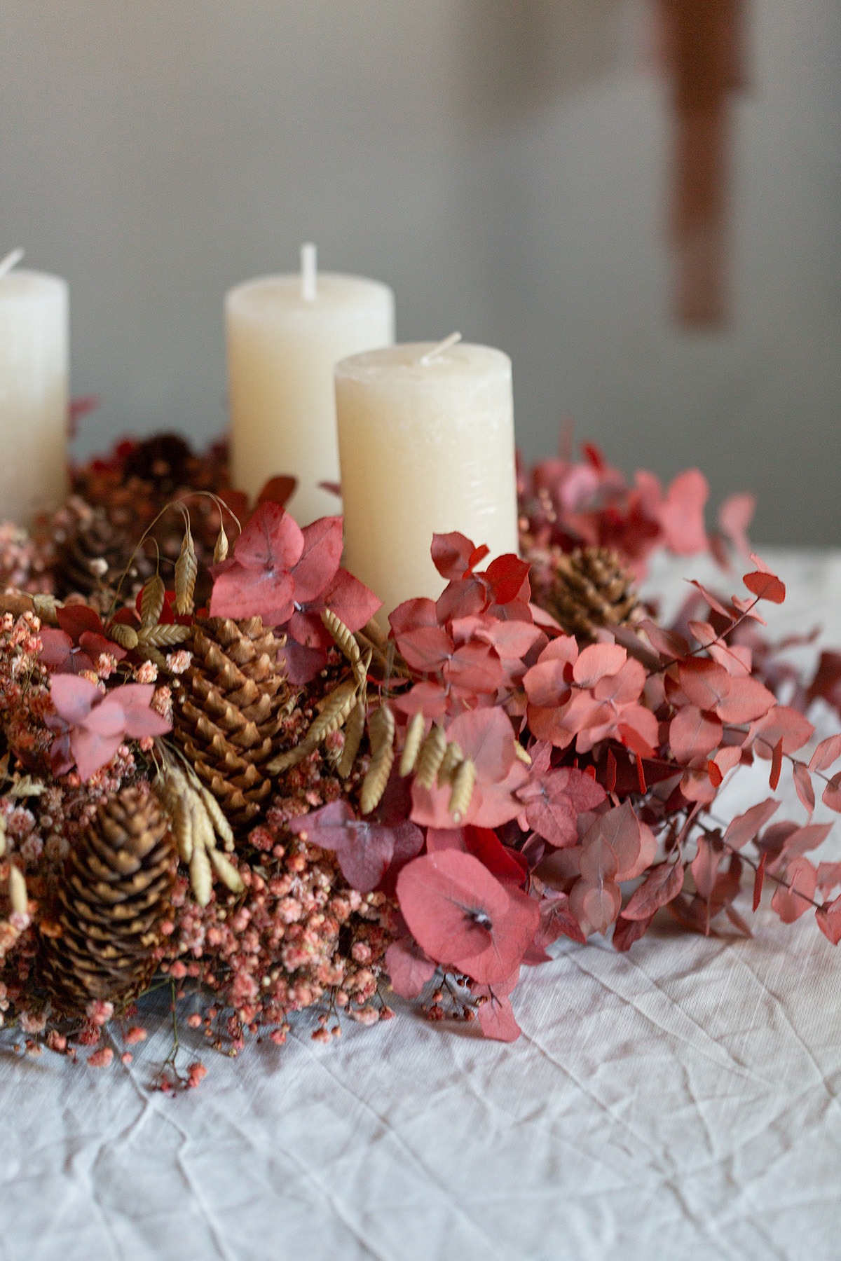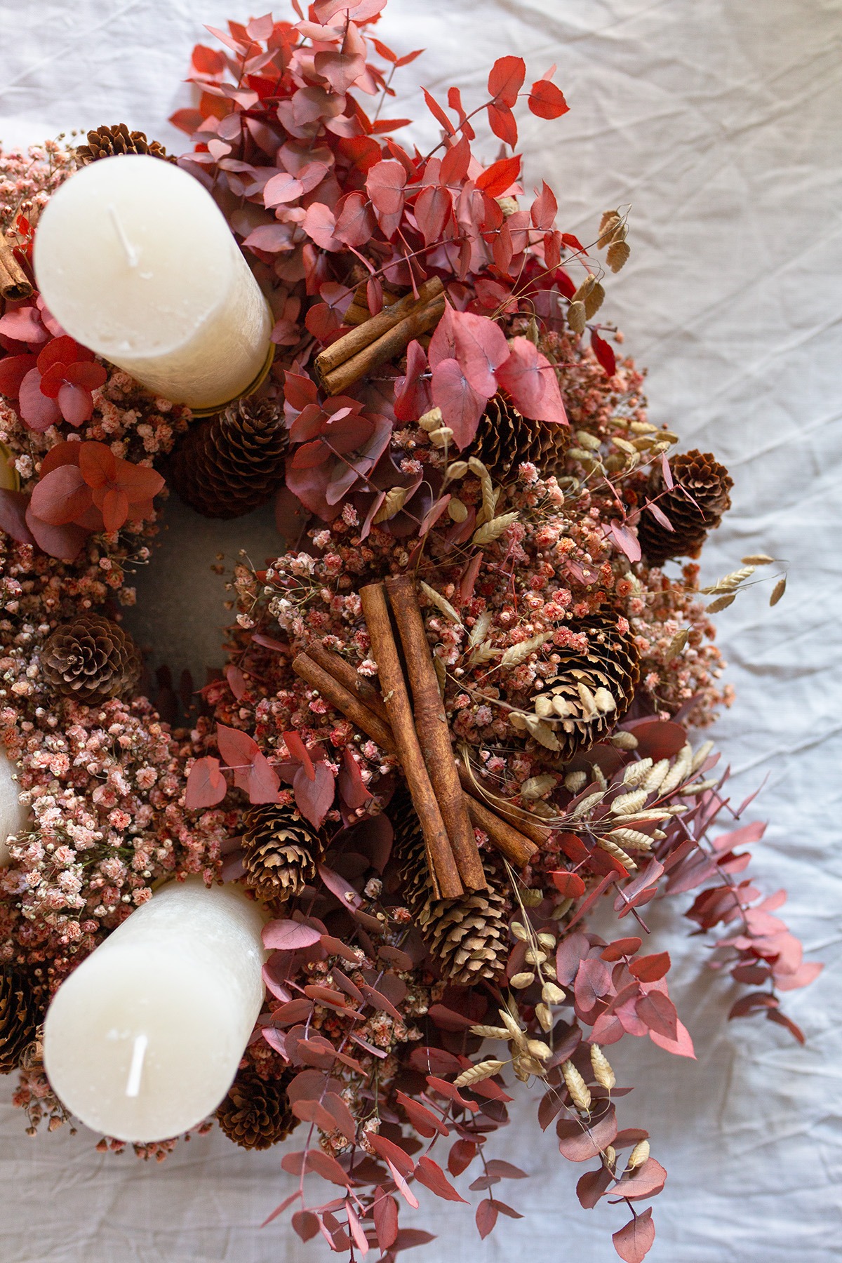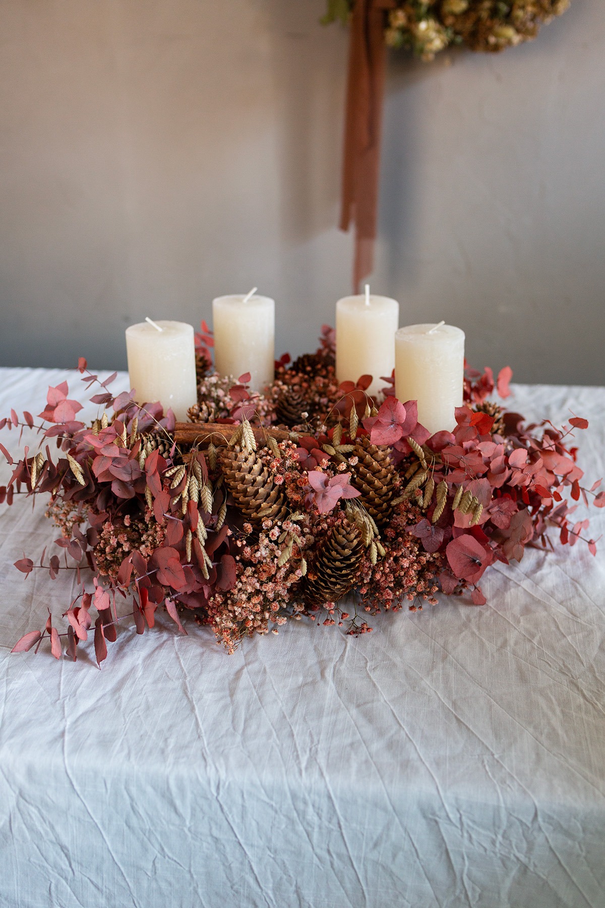 Bring the festive season to life with our handcrafted Advent wreath (approx. 48 cm in diameter), designed with care and a deep love for natural materials. This elegant piece features fresh reddish-pink dyed eucalyptus, copper-toned baby’s breath, pine cones, and cinnamon sticks, beautifully arranged around four sand-colored pillar candles.